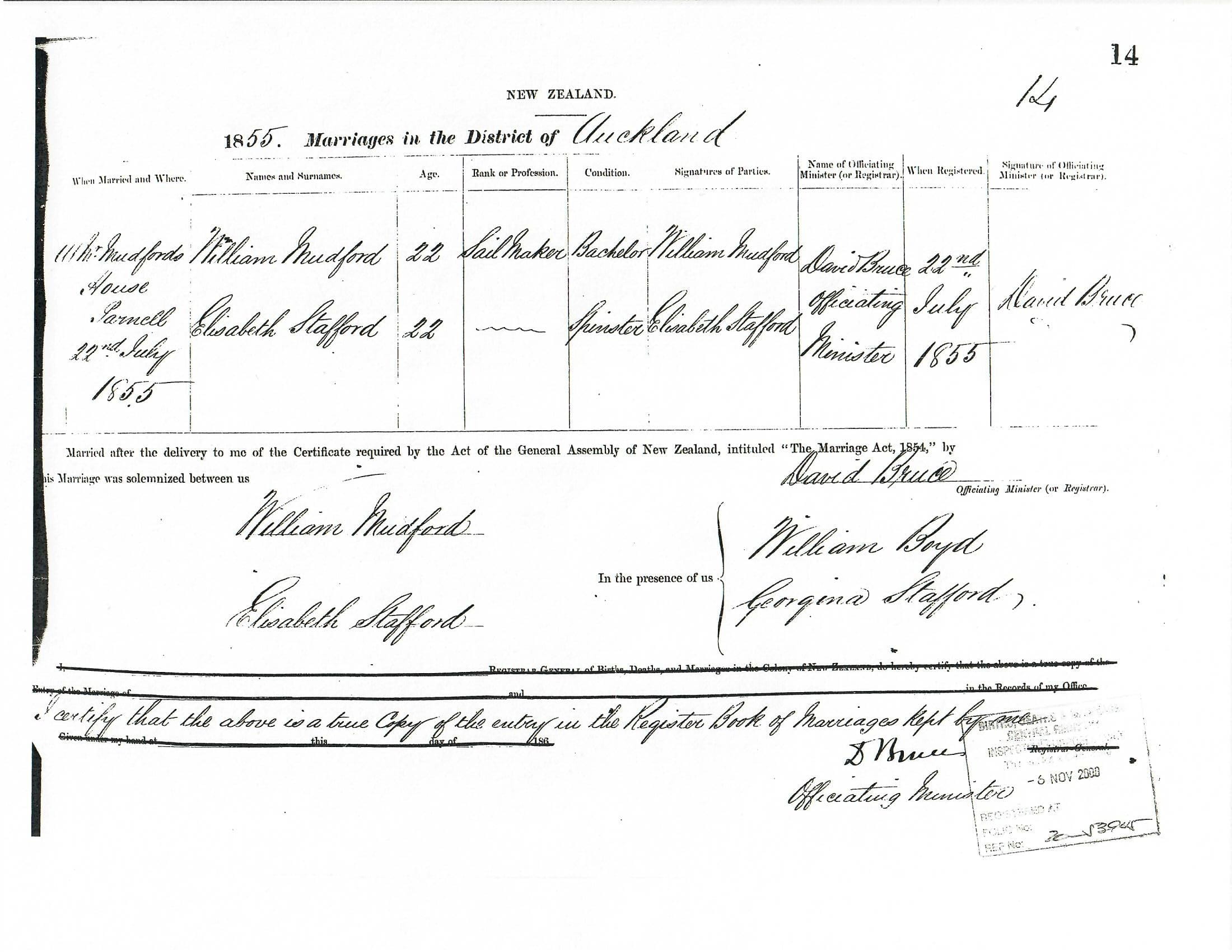 William married Elizabeth Stafford on the 11'th July 1855. The marriage registration states that they were married in William's house in Parnell. The witnesses were William's brother-in-law William Boyd and Elizabeth's sister Georgina Stafford.